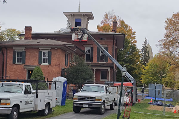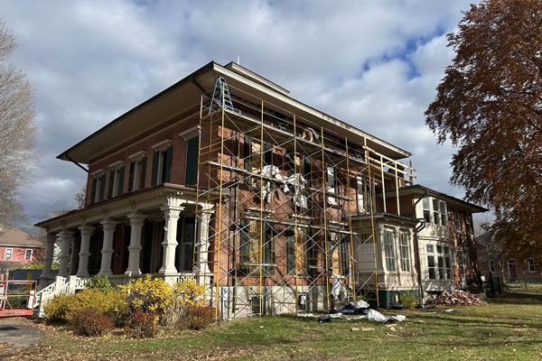 Major structural and exterior restoration is complete, including Belvedere realignment, roof and attic framing, masonry and chimney reconstruction, and new roofing and flashing. Original materials were carefully salvaged and preserved to maintain the home’s historic character.